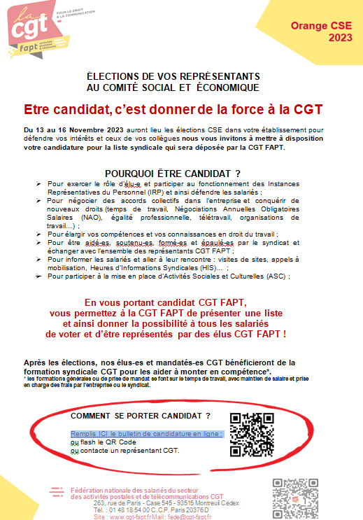Remplis ICI le bulletin de candidature en ligne : http://cse2023.cgtfapt-orange.fr/