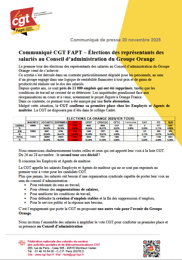 Le 1er tour des élections des représentants des salariés au Conseil d’administration du groupe Orange vient de s’achever.